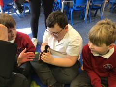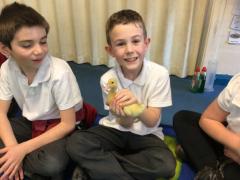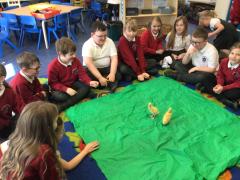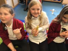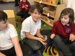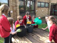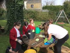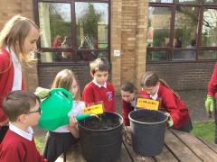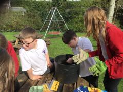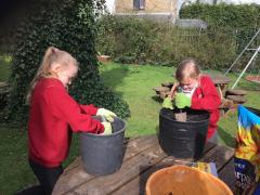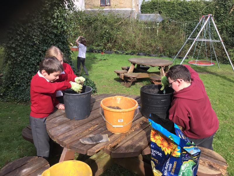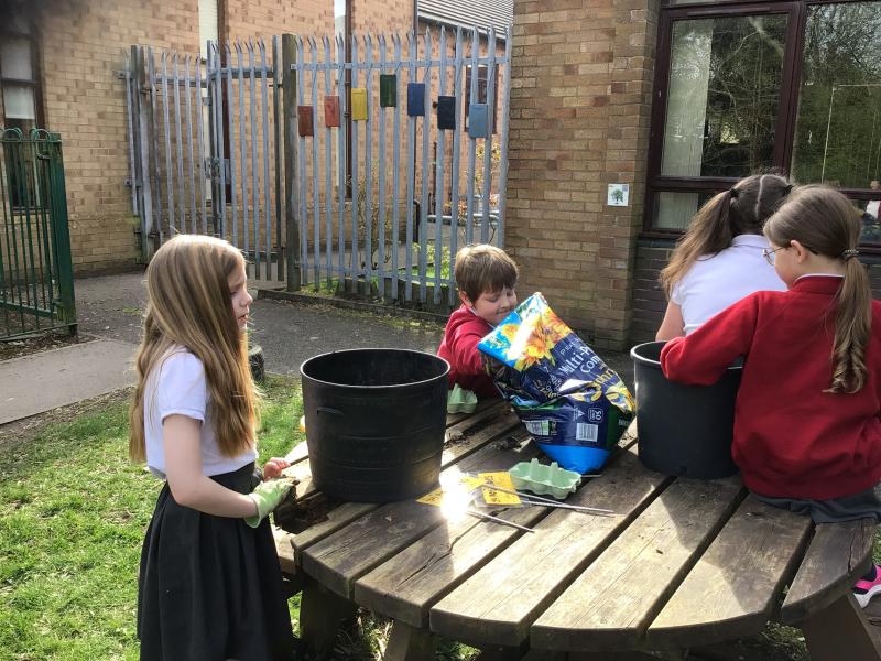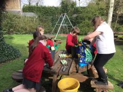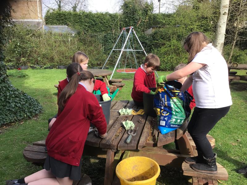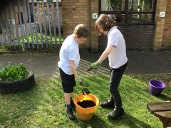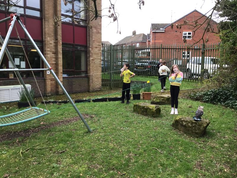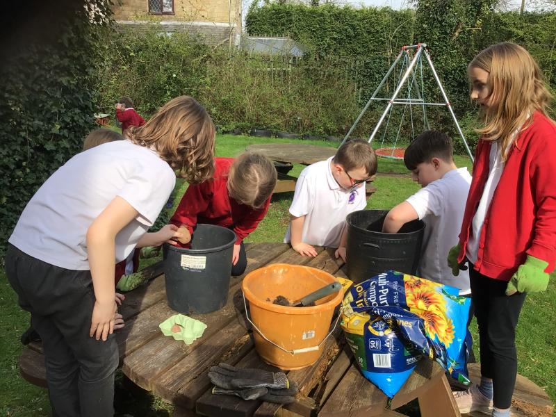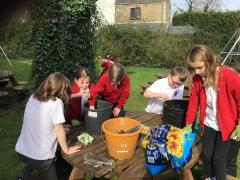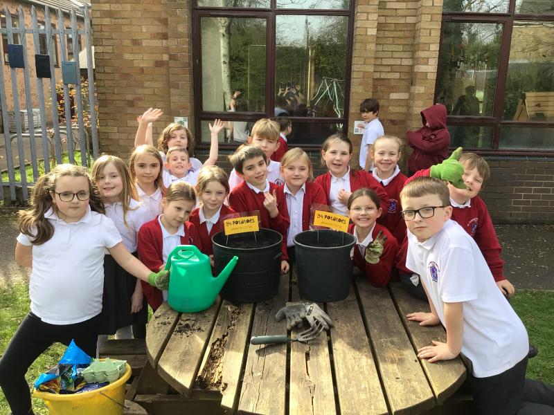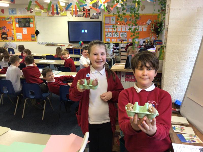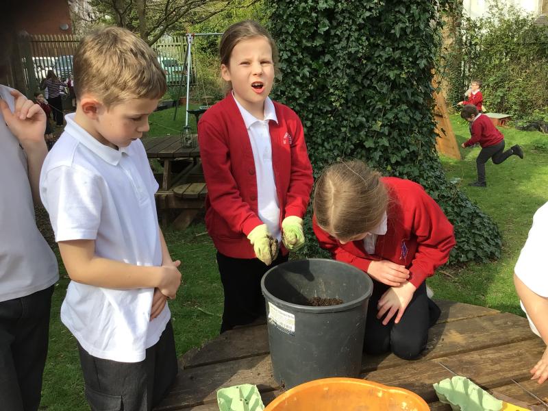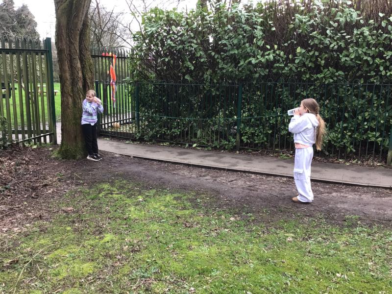 Alongside their curriculum topic of sound, Y4 also planted potatoes as part of their Science week. When each group had had their turn planting they tested which string could carry vibrations best in their homemade telephones.